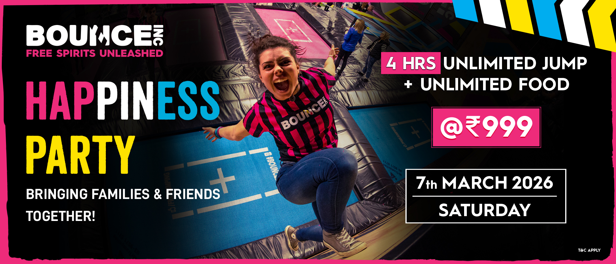 At BOUNCE India, we create and celebrate joy, freedom and self-powered adrenaline in a vibrant, inclusive environment. As part of a global freestyle movement, we inspire self-expression and human connection through an epic blend of fun and physical activity. Our 40,000 sq. ft. indoor adventure park features 100+ interconnected trampolines, freestyle zones and adrenaline-pumping activities like X-Park, Big Bag, Slam Dunk and more. It’s the ultimate place to build balance, coordination and confidence, whether you’re mastering flips, running The Wall or simply having fun.